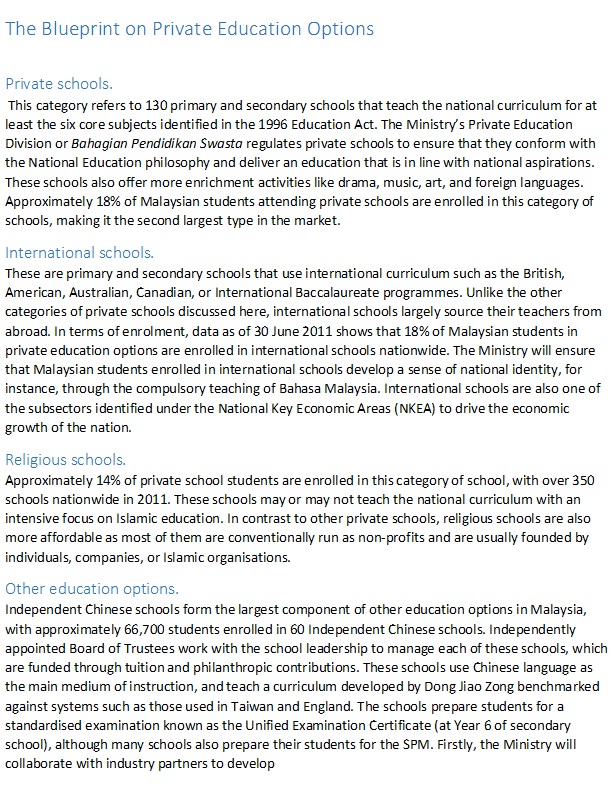 A small but growing number of students enroll in private schools. These schools operate at both the primary and secondary level and include private schools that teach the national curriculum, international schools and religious schools. Currently, private schools comprise 1% of total primary enrolments and 4% of total secondary enrolments. Malaysia Education Blueprint 2013 - 2025
