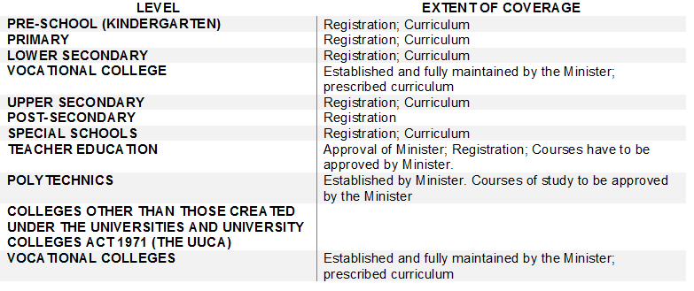 The EA1996 establishes a five-tiered (pre-school, primary education, secondary education, post-secondary education, higher education) NES that is described in detail below. The binding factors of the NES are full or partial government support, a common medium of instruction, except in the case of vernacular primary schools, and a standard statutorily prescribed curriculum.